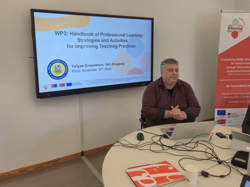 Четвъртата транснационална среща по проект 2023-2-TR01-KA220-SCH-000170568 „Овластяване на учителите в средните училища за социално включване чрез професионално развитие, базирано на наблюдение“ се проведе в дните 18-20 ноември 2025 г. в Порто, Португалия. В нея взеха участие представители на всички партньори по проекта: домакините от Universidade do Porto, СА „Д. А. Ценов“ (Свищов, България), EGE University (Измир, Турция), Academia, izobrazevanje in druge storitve d.o.o. (Марибор, Словения), Oslo Metropolitan University (Осло, Норвегия), а Me We Istituto di ricerca innovativa srl (Флоренция, Италия) се включиха онлайн, поради здравословни причини. Представителите на Стопанска академия бяха гл. ас. д-р Юлиян Господинов - ръководител на проекта за Академията и изследовател, и доц. д-р Николай Нинов - изследовател.