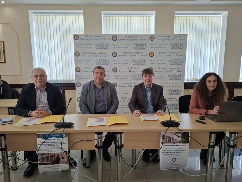 След информационната среща ИНИ проведе научна сесия под надслов „Устойчив и дигитален преход – иновации, знание и трансформация на икономиката”, на която бяха представени резултатите от реализираните научноизследователски проекти, финансирани от държавната субсидия за научна дейност на Свищовската академия през 2024 и 2025 г. Приветствие към участниците поднесе ресорният зам.-ректор проф. д-р Атанасов. Той поясни, че научноизследователската дейност в СА „Д. А. Ценов“ през 2025 г. е била фокусирана в следните три научни приоритети: Ускорено икономическо развитие; Кръгова и нисковъглеродна икономика, устойчиво развитие и иновации; Изкуствен интелект, дигитална трансформация и управление на знанието. От представените данни стана ясно, че през 2025 г. са одобрени 14 проекта – 4 екипни научноизследователски (едногодишни) проекта, 5 инфраструктурни проекти за провеждането на качествени и конкурентоспособни научни изследвания (двугодишни) проекта и 5 проекта за частично финансиране на научен форум. През 2025 г. продължава изпълнението на два инфраструктурни проекта за провеждането на качествени и конкурентоспособни научни изследвания (стартирали през 2024 г.). В изпълнение на проектните дейности са включени 189 научни работници от Академията, от които 30 хабилитирани преподаватели, 51 нехабилитирани преподаватели, 47 докторанти и 61 студенти. С оглед разпространение на научната продукция и популяризиране резултатите от проведените научни изследвания, през 2025 г. членовете на екипите по отделните научноизследователски проекти са участвали в 20 български и 19 международни научни форума и са публикувани общо 52 доклада, 13 статии, 7 студии и 4 монографии, реферирани и индексирани в световни първични и вторични литературни източници.