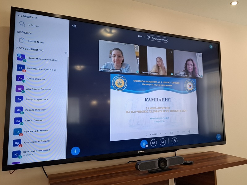Информационна среща проведе Институтът за научни изследвания във връзка със стартирането на Кампания ‘2026 г. на СА „Д. А. Ценов“ за научноизследователски проекти, финансирани от държавната субсидия. На форума присъстваха тримата зам.-ректори проф. д-р Атанас Атанасов, проф. д-р Светослав Илийчовски и доц. д-р Здравко Любенов.