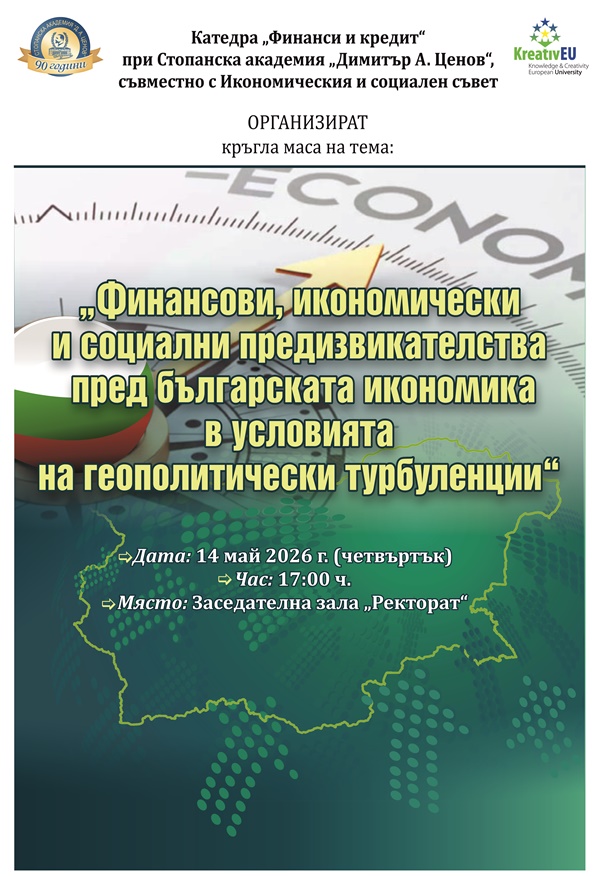 Катедра „Финанси и кредит“ при Стопанска академия „Димитър А. Ценов“, съвместно с Икономическия и социален съвет (ИСС), организира кръгла маса на тема „Финансови, икономически и социални предизвикателства пред българската икономика в условията на геополитически турбуленции“.