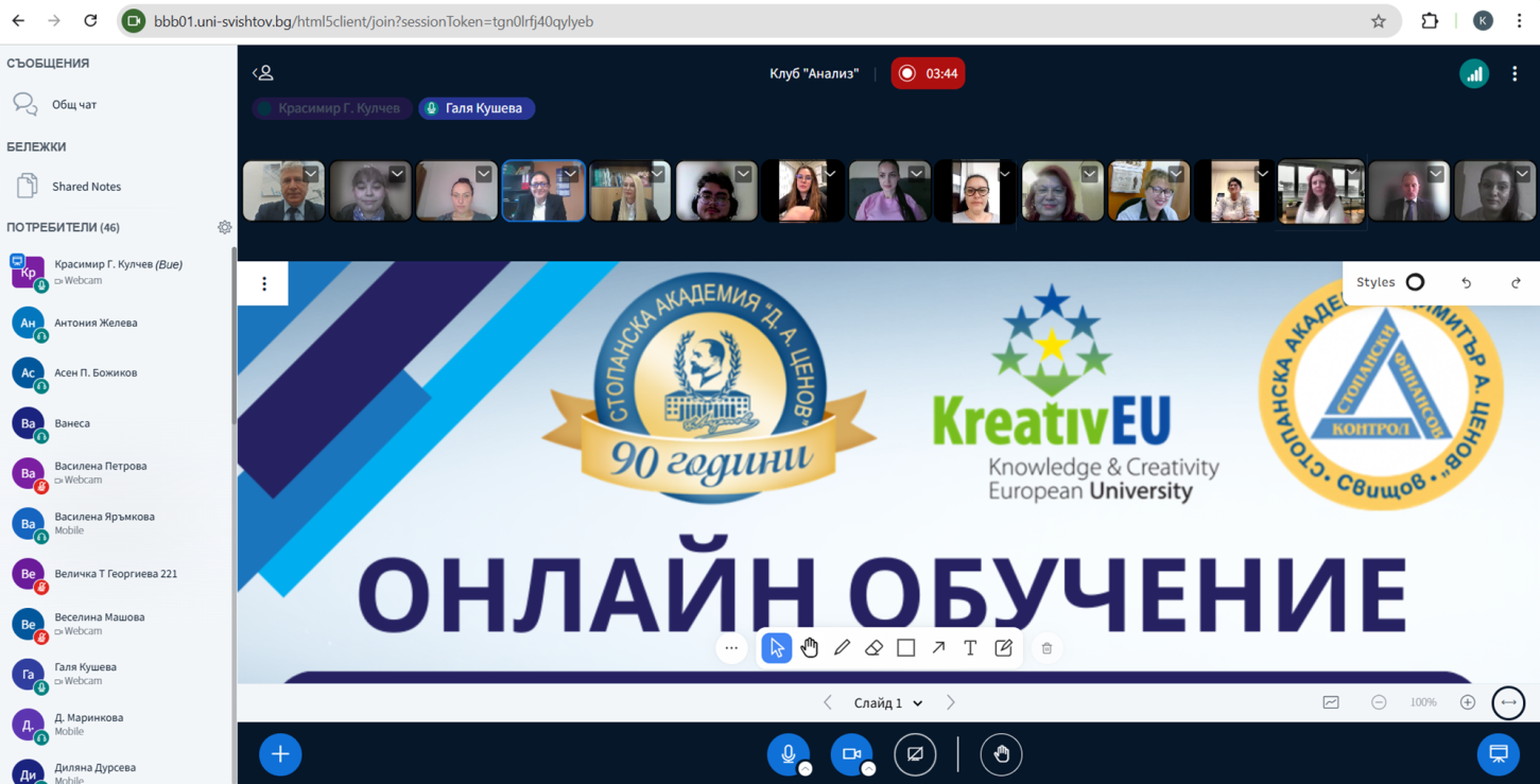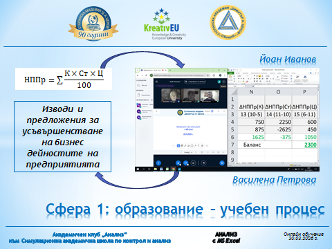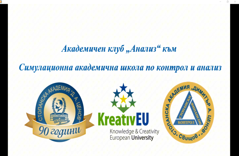 На 30.03.2026 г. екипът на катедра „Контрол и анализ на стопанската дейност“ проведе онлайн обучение на тема: „АНАЛИЗ С MS EXCEL: Сфери на приложение в образованието и професията“. Обучението се организира от клуб "Анализ" към Симулационната академична школа по контрол и анализ. Доц. д-р Красимир Кулчев представи основните сфери на приложение на анализа с MS Excel и лекторите в онлайн обучението.