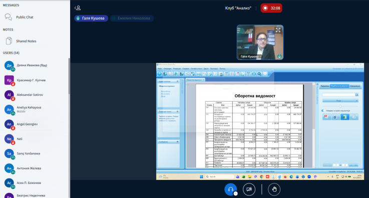 Доц. д-р Росица Колева говори за ползите от аналитичните функции на MS Excel в професията на държавния администратор. Сред тях тя открои улеснената обработка на големи обеми данни, намаляването на риска от грешки, повишаването на прозрачността и подобряването на качеството на административните услуги. Доц. Колева подчерта, че MS Excel е ценен практически инструмент, който е добре студентите да познават, защото биха могли да го срещнат в почти всяка институционална среда. Гл. ас. д-р Галя Кушева потопи зрителите в реална работна среда. Тя демонстрира приложението на анализа с MS Excel при решаването на ежедневни счетоводни казуси и задачи.