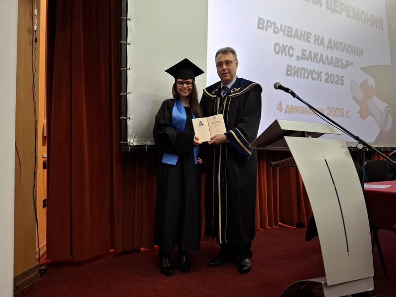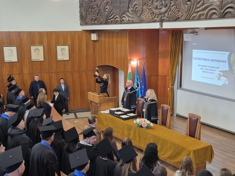 В рамките на две тържествени церемонии, в Стопанска академия „Димитър А. Ценов“ бяха връчени дипломите на абсолвентите в ОКС „бакалавър“ от Випуск `2025. Церемониите се проведоха паралелно, като едната бе за факултети „Производствен и търговски бизнес“ и „Мениджмънт и маркетинг“, а другата – за факултети „Финанси“ и „Стопанска отчетност“. Приветствия към дипломантите поднесоха деканите на четирите факултета: проф. д-р Любчо Варамезов – ф-т „Производствен и търговски бизнес“, доц. д-р Ваня Григорова – ф-т „Мениджмънт и маркетинг“, доц. д-р Румен Ерусалимов – ф-т „Финанси“, доц. д-р Маргарита Шопова – ф-т „Стопанска отчетност“.