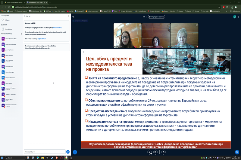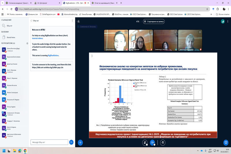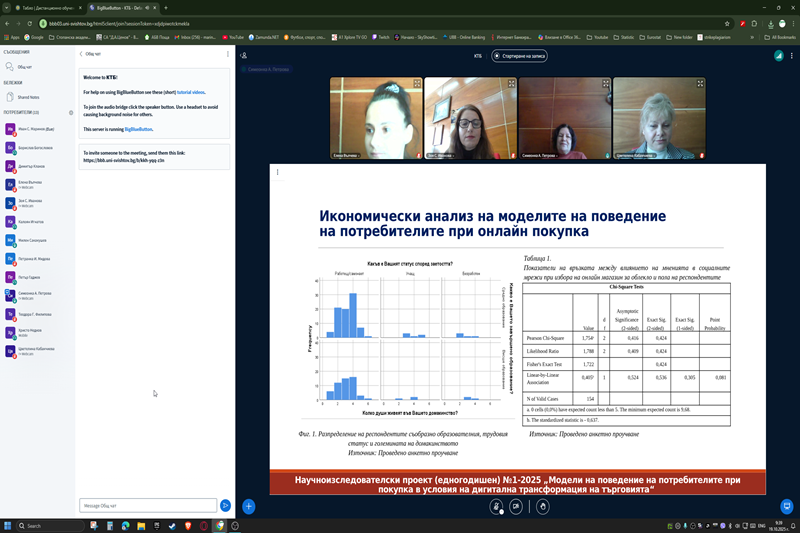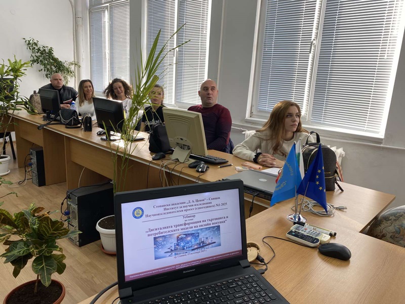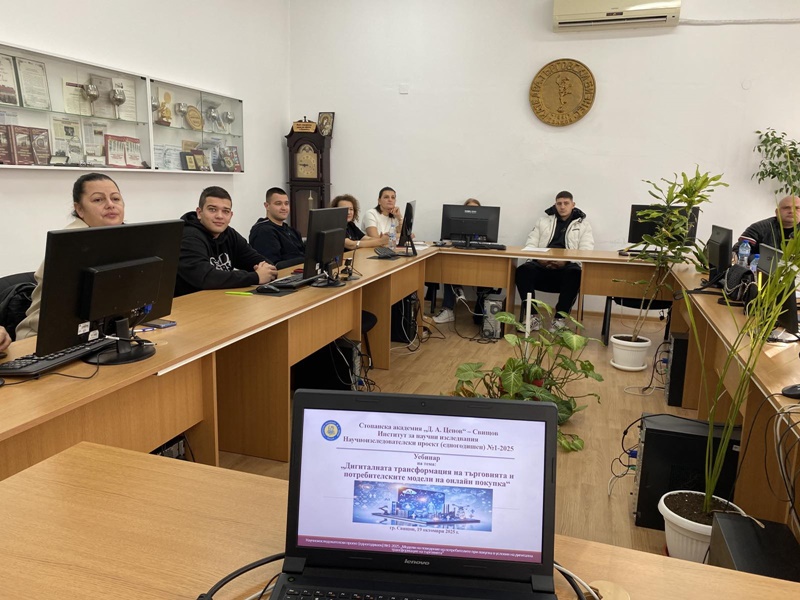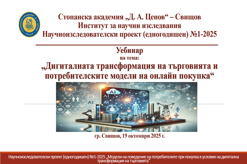 На 19 октомври 2025 г. в Стопанска академия „Д. А. Ценов“ – Свищов се проведе уебинар на тема: „Дигиталната трансформация на търговията и потребителските модели на онлайн покупка“. Научното събитие бе организирано в хибриден формат – присъствено в специализиран кабинет по търговия и чрез видеоконферентна връзка. Форумът е планувана дейност за представяне на получени резултати по Научноизследователски проект (едногодишен) №1-2025 „Модели на поведение на потребителите при покупка в условия на дигитална трансформация на търговията“. Проектното предложение е финансирано по конкурсна процедура към Института за научни изследвания от държавна субсидия за присъща на висшето училище научна дейност. Съставът на екипния проект включва преподаватели от катедра „Търговски бизнес“ и студенти, обучавани по специалност „Икономика на търговията“, ОКС „бакалавър“. Мероприятието събра 31 участници – преподаватели, студенти и представител от практиката.