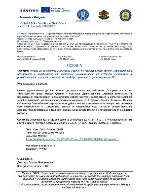 На 20 ноември 2025 г. в Стопанска академия „Д. А. Ценов“ – Свищов и чрез видеоконферентна връзка чрез Zoom се проведе събитие „Отворени врати“ по проект ROBG00251 Cross-Border Youth Safety and Inclusion: Modernizing Training Facilities and Developing a Comprehensive Good Practices Guide (CBYSI), Програма ИНТЕРРЕГ VI-A Румъния–България 2021–2027. Проектът се осъществява с водещ партньор Инспектората на полицията в окръг Долж, Румъния, в партньорство със Стопанската академия и асоцииран партньор – Окръжния училищен инспекторат Долж.