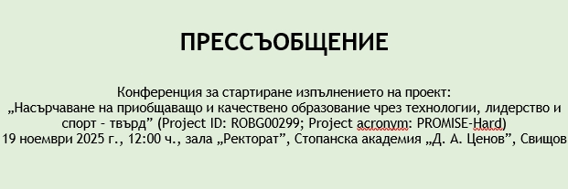 19 ноември 2025 г. в Стопанска академия „Д. А. Ценов“ – Свищов се проведе откриваща конференция по проект „PROMoting IncluSivE and Quality Education through Technology, Leadership and Sport – Hard“ (PROMISE-Hard), с акроним ROBG00299.