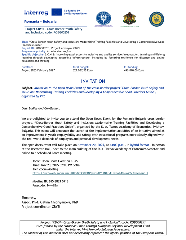 Subject: Invitation to the Open Doors Event of the cross-border project "Cross-Border Youth Safety and Inclusion: Modernizing Training Facilities and Developing a Comprehensive Good Practices Guide", organized by the D. A. Tsenov Academy of Economics, Svishtov, Bulgaria